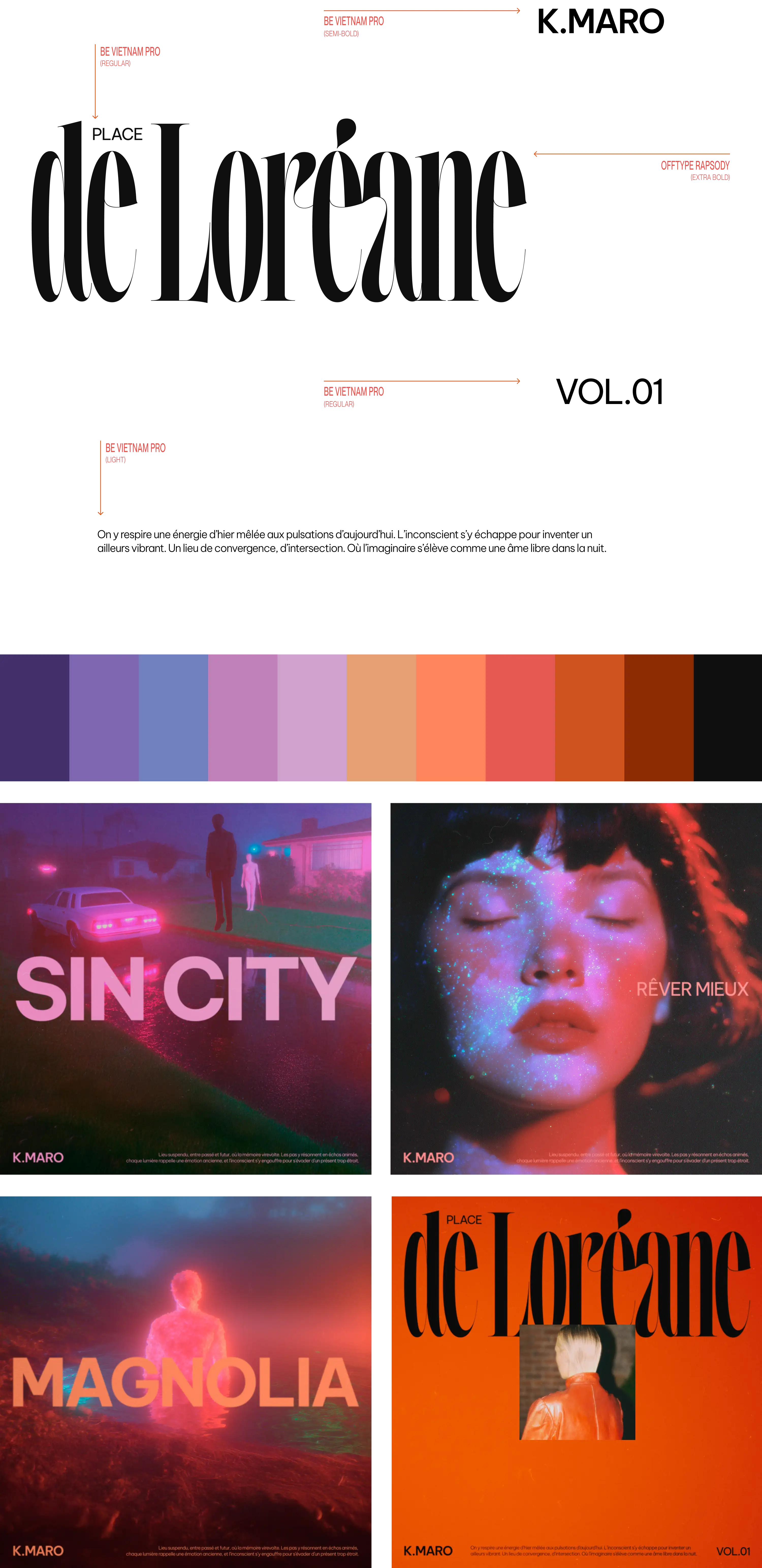 Place de Loréane is a fictional world imagined as the first volume of an evolving visual and musical project. Rather than treating it as a traditional album campaign, PDT Studio approached the project as a system of images designed to unfold across formats, accompanying the artist K. Maro’s shift toward a more mature form of writing. Rooted in retro-futuristic references, the universe crosses chanson française nostalgia and mid-century romanticism with a North American electro-futuristic imagery from the 1980s–90s, shaped by neon light, urban signage, and artificial landscapes. This hybrid approach allows multiple narratives and emotional states to coexist within the same place. The visual language gradually moves from colder distance toward warmer intimacy, echoing the music’s progression. Photography anchors the project in reality through the main album cover, while AI and 3D are used as directed tools to construct custom imagery and a singular digital environment. Together, film, artificial imagery, and design form a coherent system built to persist and evolve over time.